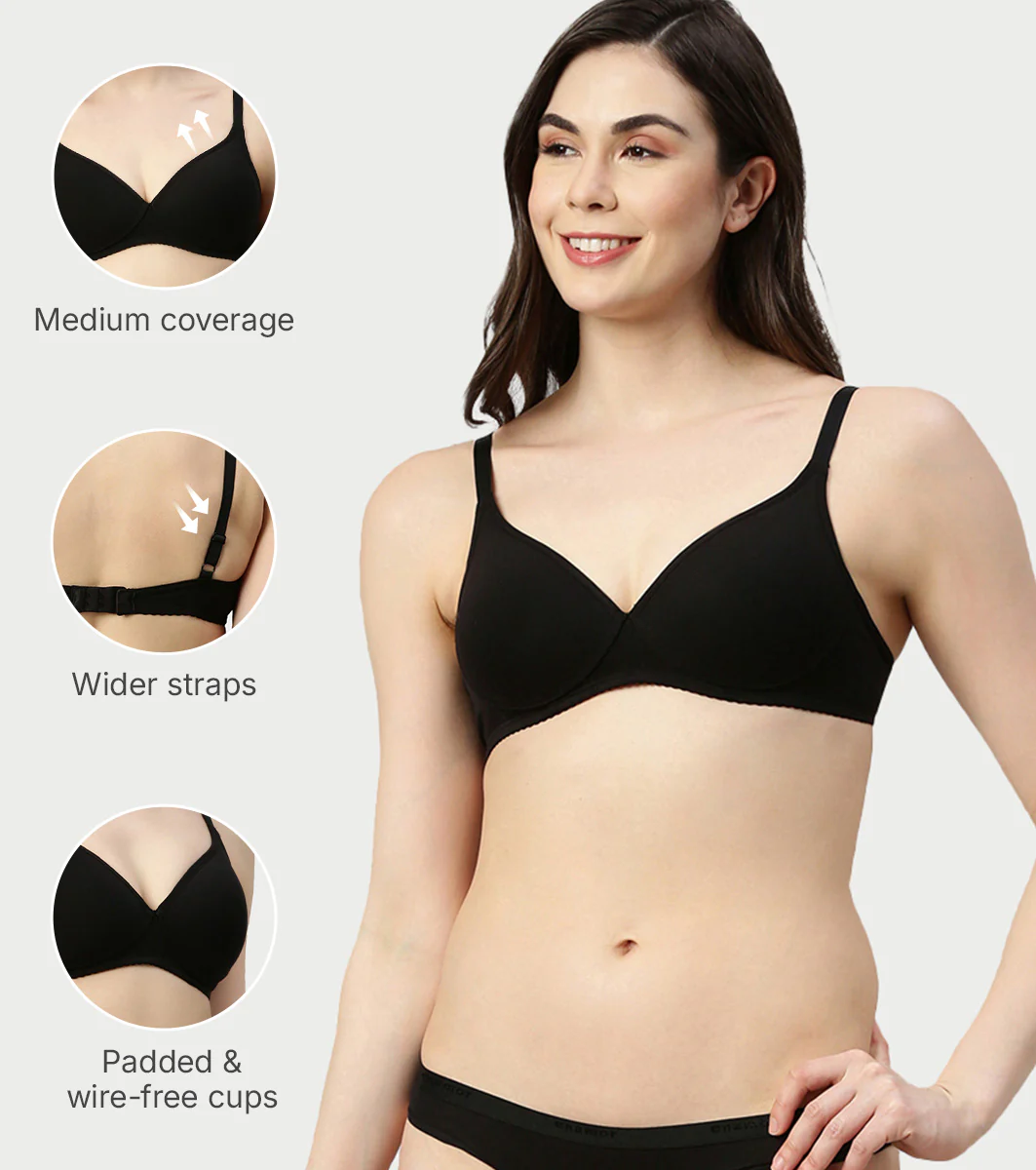 Enamor Supima Cotton Women's Plunge Lift Everyday T-Shirt Bra - Extra Comfort, Padded, Wirefree, Medium Coverage - A039 (Black)