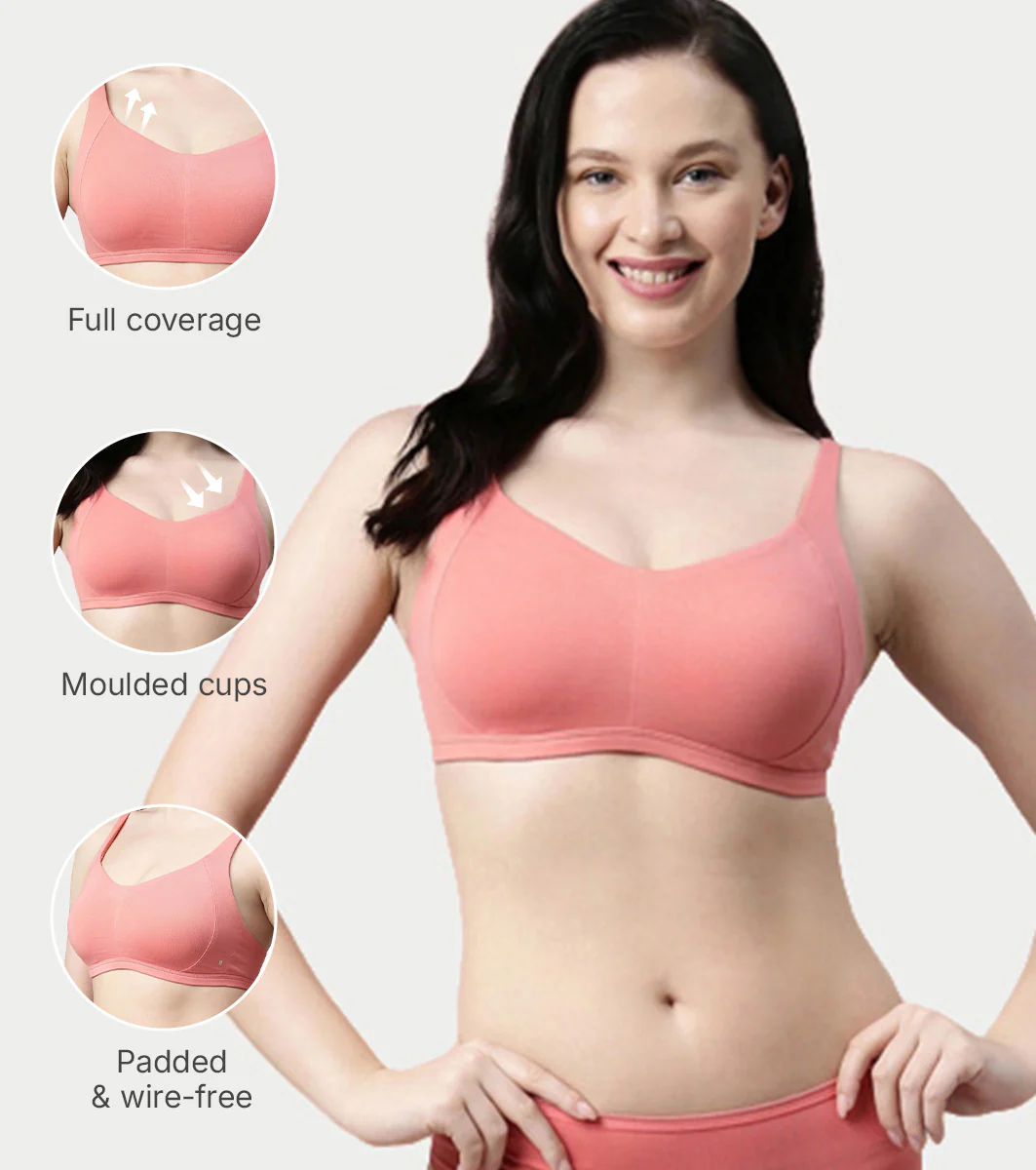Enamor Innovations Intellifresh Antimicrobial Minimizer Everyday Cotton Bra for Women - Padded, Wirefree, Full Coverage - A058 (Peach Blossom)