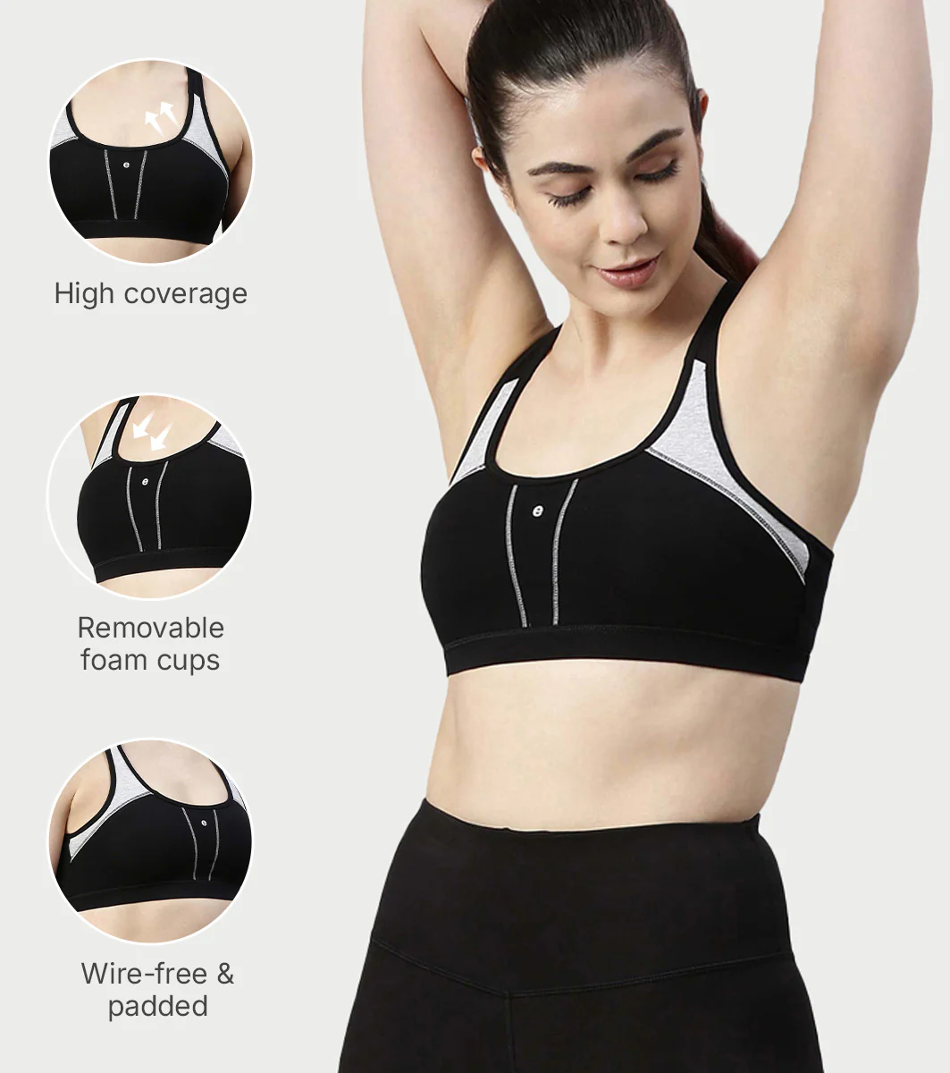 Enamor Medium Impact, Side Panel Shaping, Racer Back Women's Cotton Sports Bra - Padding with Removable Cups, Wirefree, High Coverage - SB08 (Black)