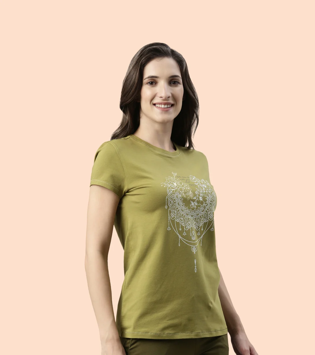 Enamor Short Sleeve Crew Neck Regular Length Basic Crew T-Shirt - Slim Fit, Soft and Breathable Stretch Cotton - E147 (Thai Green/Mandala)