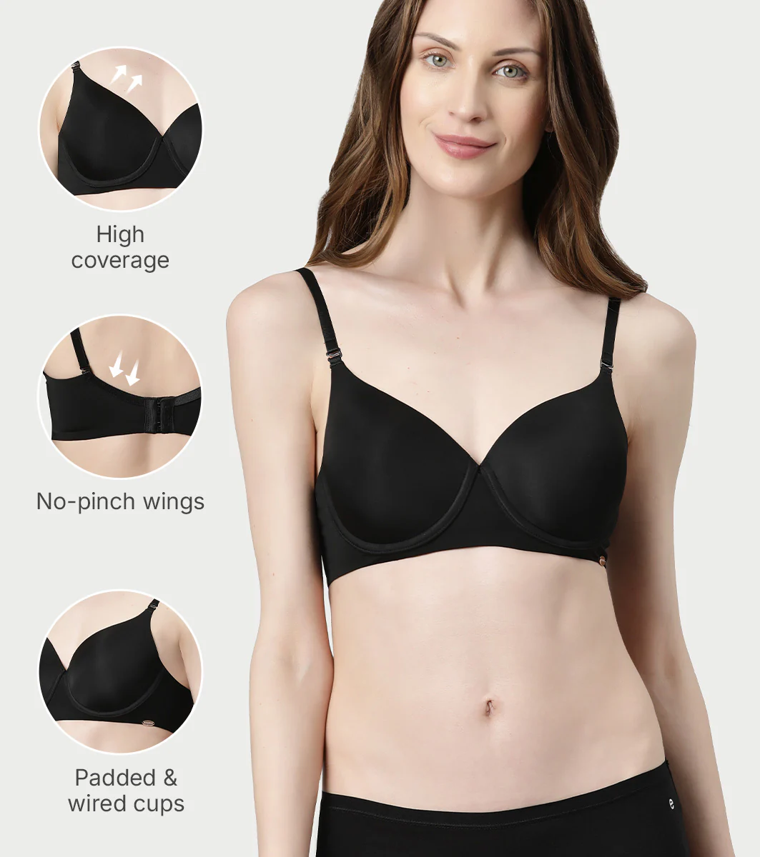 Enamor Innovations Ecolite, Smoother Perfect Lift Women's T-Shirt Bra - Crush Proof Cups, Padded, Wired, High Coverage - F057 (Black)