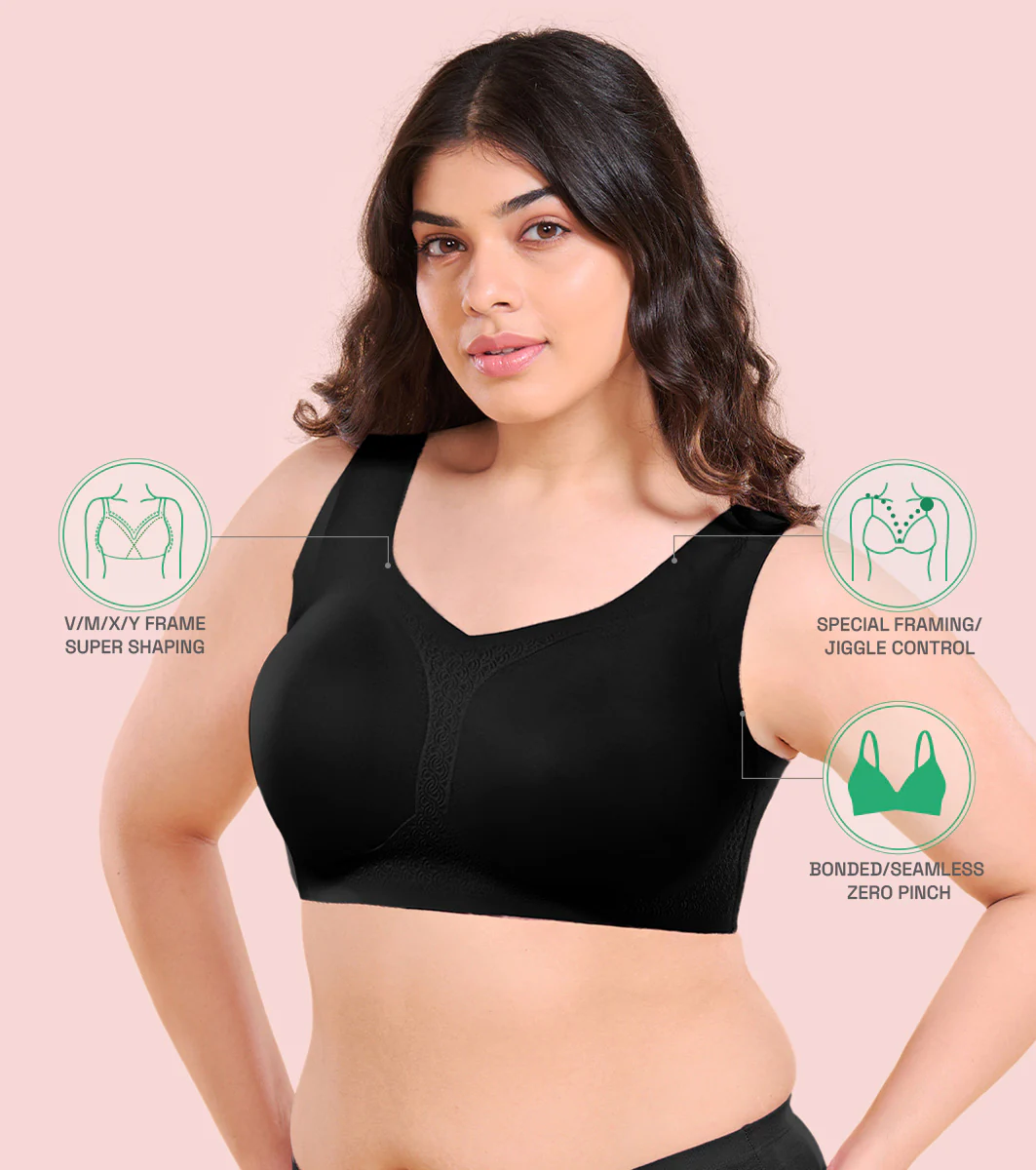 The Enamor INVISI MINIMIZER LIFT Bra (IO03) offers smoother minimized hold with injection-bonded side wings for shaping and jiggle control. Features include metal-free straps, elastic-free support, and insert cups for no nipple show-through. All-day comfort and ease of wear.