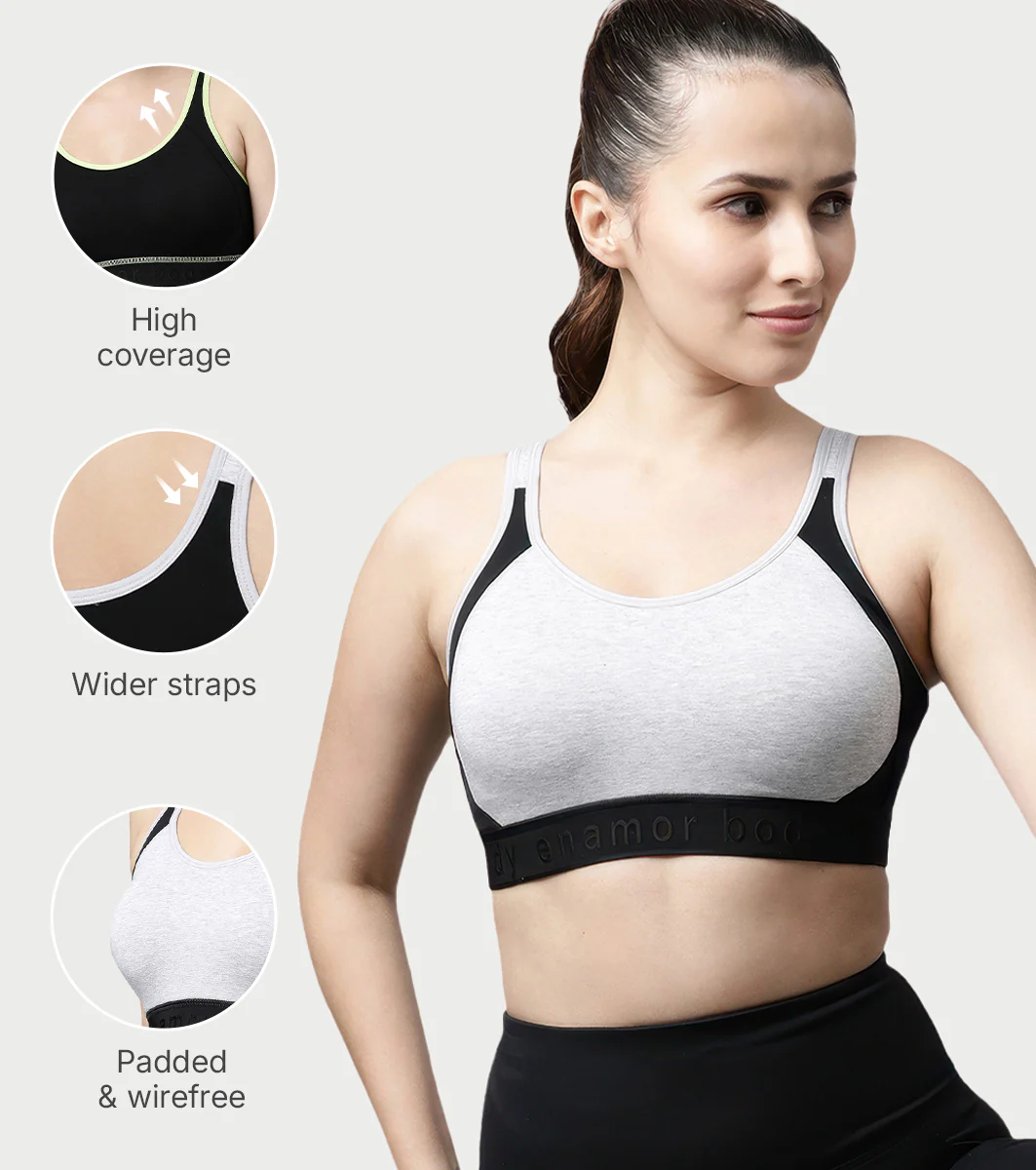 Enamor Innovations Antimicrobial, Side Shaper, Women's Cotton Medium Impact Sports Bra - Fixed cup, Non-Padded, Wirefree, High Coverage - SB28 (Grey Melange)
