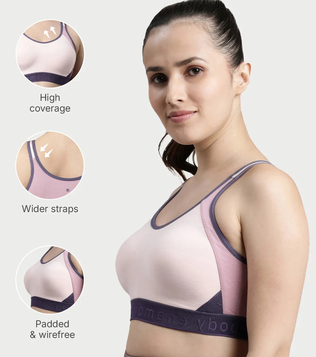 Enamor Innovations Antimicrobial, Side Shaper, Women's Cotton Medium Impact Sports Bra - Fixed cup, Non-Padded, Wirefree, High Coverage - SB28 (Parfait Pink)